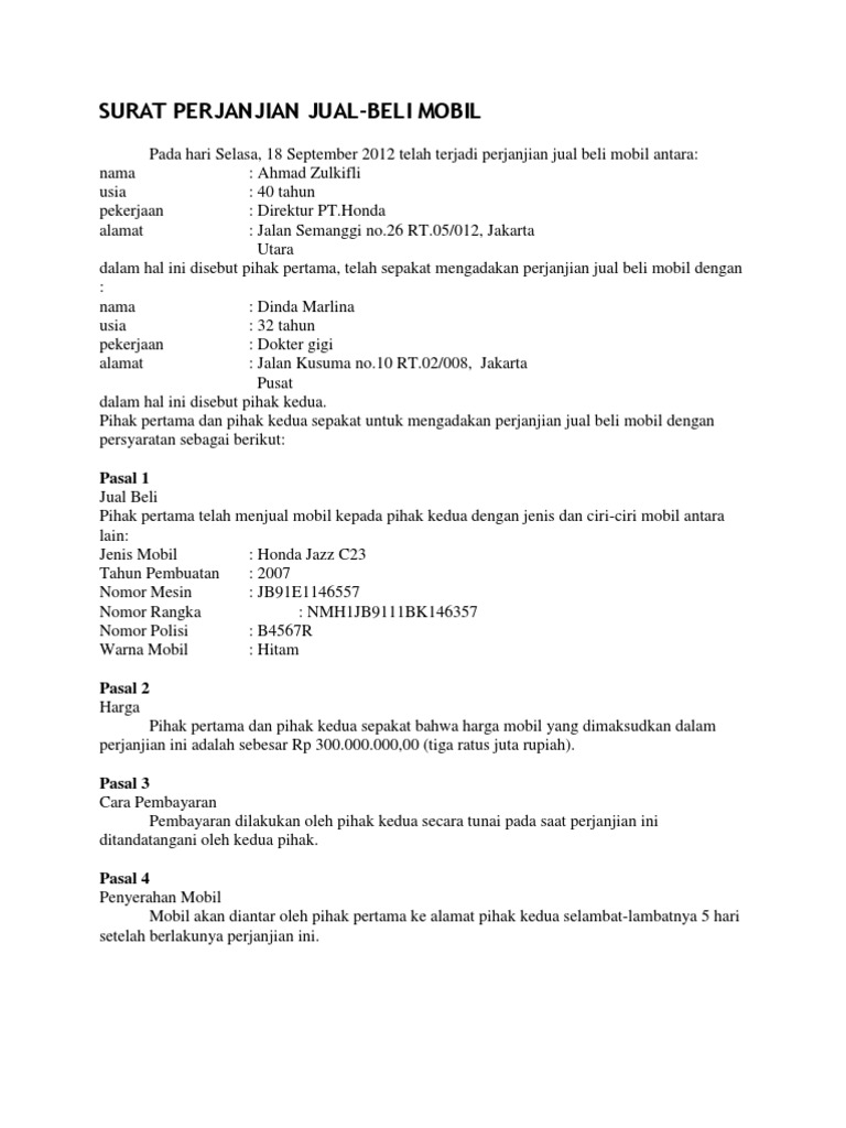 Contoh Surat Perjanjian Jual Beli Kereta from imgv2-1-f.scribdassets.com Dalam dunia bisnis, surat perjanjian jual beli sangat penting bagi penjual maupun pembeli. Contoh surat perjanjian jual beli sangat beragam karena ada banyak jenisnya seperti surat perjanjian jual beli rumah, surat perjanjian jual beli motor, surat perjanjian jual beli tanah, dll. Perjanjian jual beli, perjanjian sewa menyewa. Jual beli tanah tersebut dilakukan dan disetujui oleh kedua belah pihak dengan harga tanah sebesar rp 250.000.000,00 (dua ratus lima puluh juta rupiah). Yang bertanda tangan dibawah ini: Dengan dibuatnya surat perjanjian ini, maka kedua belah pihak telah sepakat dan satu suara untuk melakukan transaksi jual beli motor. Surat perjanjian jual beli motor. Surat perjanjian jual beli merupakan surat yang dibuat oleh penjual dan pembeli untuk menerangkan atau menjelaskan hak dan kewajiban kedua belah pihak tersebut.